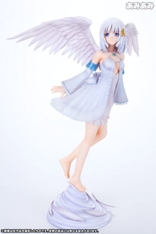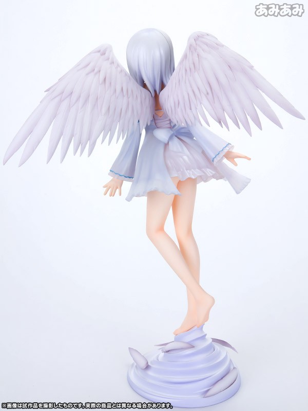 Notre ange immaculé, haut de 23 cm grâce à son socle en forme de tourbillon de vent emportant des plumes, est présenté en plein envole, élancée et esquissant un sourire par-dessus son épaule. Sa liquette blanche légèrement ouverte sur sa poitrine lui donne un petit côté juste ce qu’il faut de sexy, ainsi qu’une certaine légèreté grâce à l’effet de transparence.