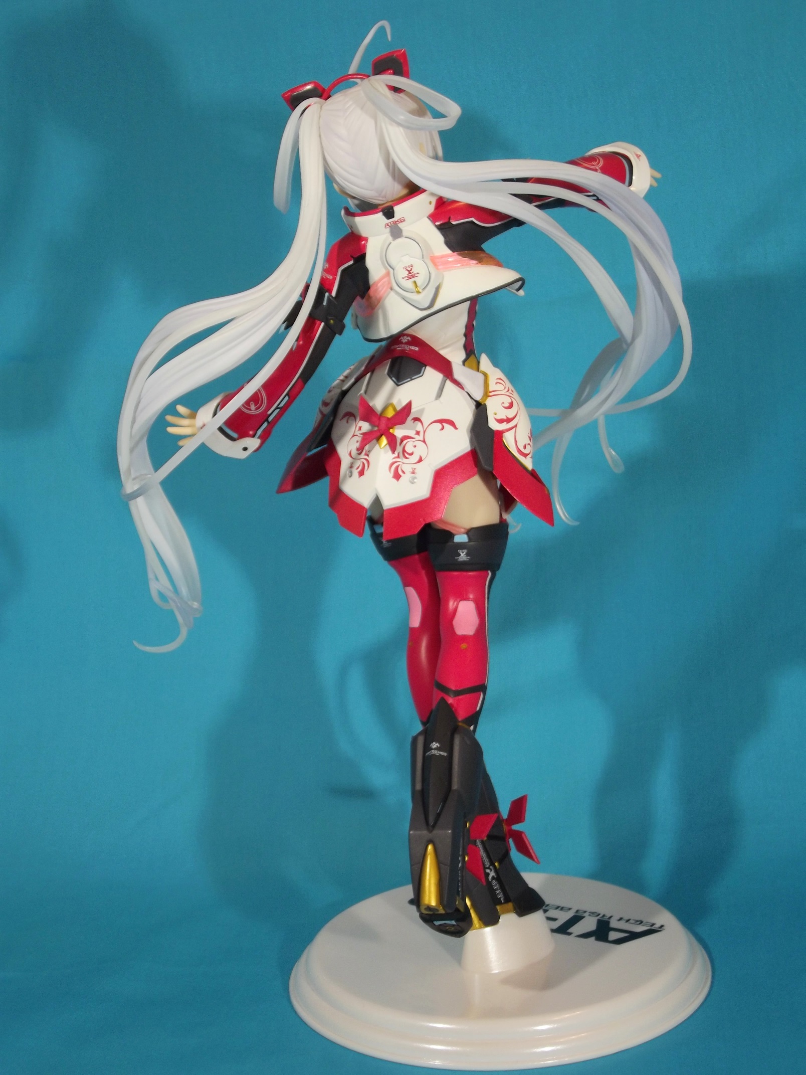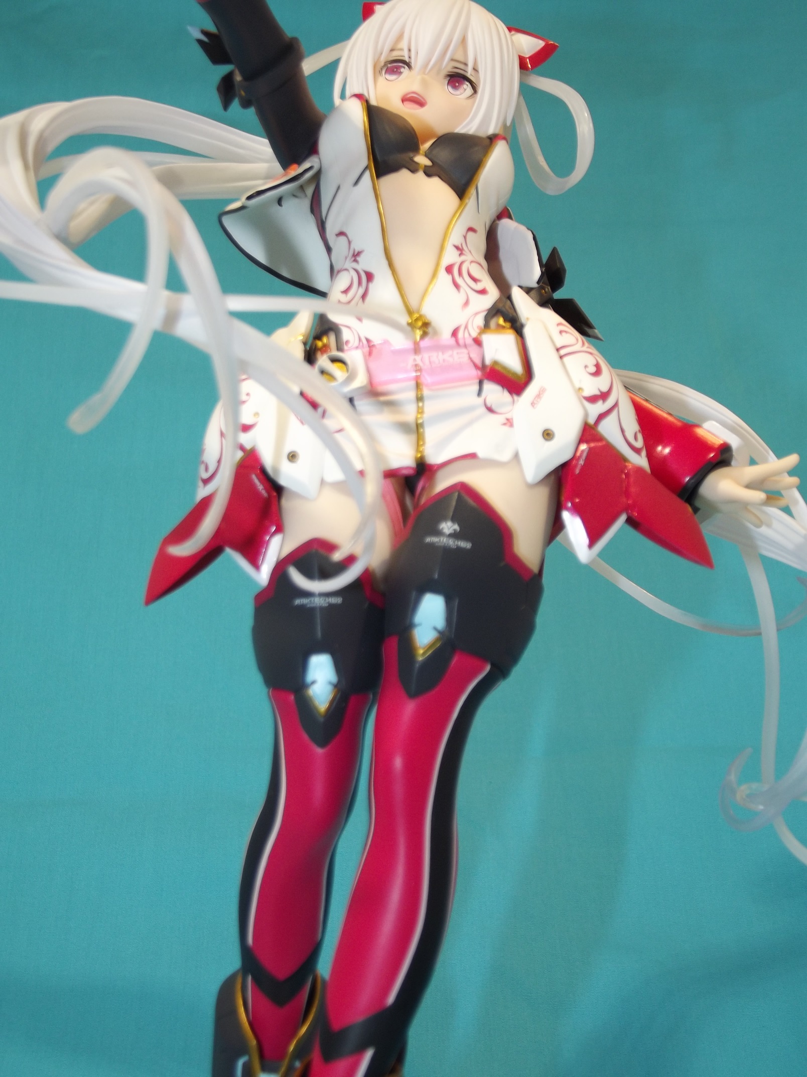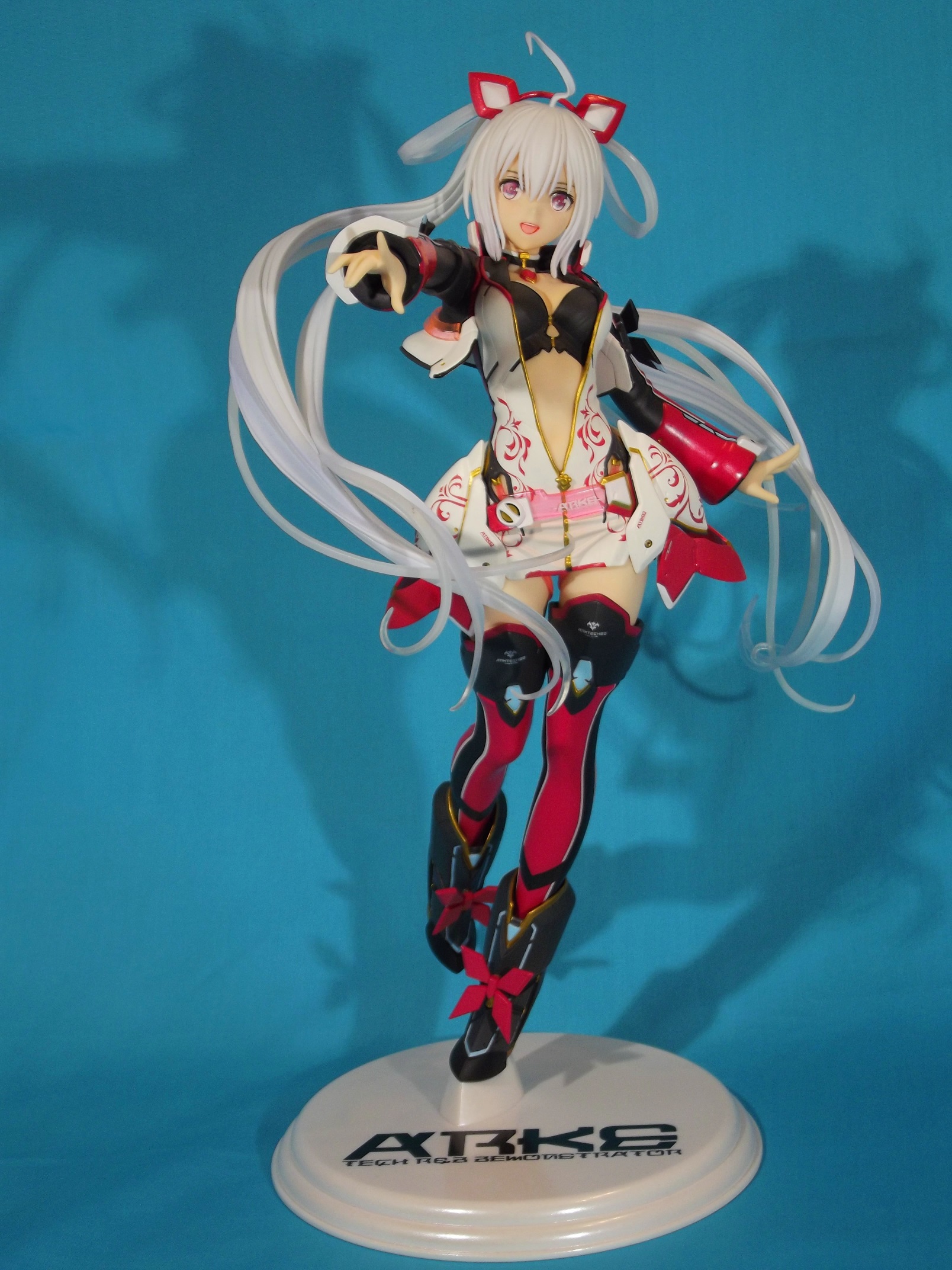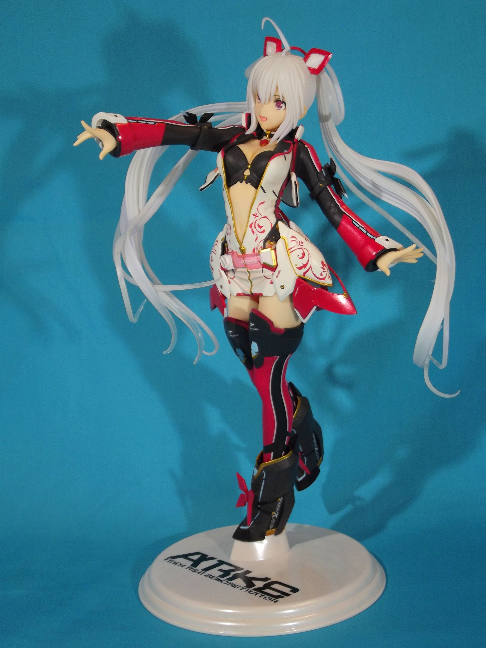 Kotobukiya nous propose donc une belle jeune femme au look SF au format 1/6, plutôt imposante, comme souvent dans la gamme 4-Leaves. Quand on la sort de sa boîte vitrine, on est déjà satisfait de voir la ressemblance avec le prototype qu'avait promis le fabricant. Rien de choquant au premier regard, la pose, la chevelure, l'expression, tout est visuellement fort plaisant. Allez, le seul petit hic : le socle, trop simpliste avec sa couleur blanche avec estampillé ARKE en typo du jeu. Un peu de couleur pour contraster avec la dominante blanche de Matoi aurait été appréciable.